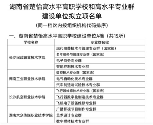 日前,湖南省教育厅、湖南省财政厅发布《关于印发<湖南省高水平高职学校和专业群及优质中职学校和专业(群)建设计划实施方案>的通知》(湘教发〔2022〕1号),公布了拟获立项建设30所楚怡高水平高职学校建设单位、30所楚怡高水平高职专业群建设单位;拟立项60所楚怡优质中职学校建设单位、52所楚怡优质中职专业(群)建设单位。